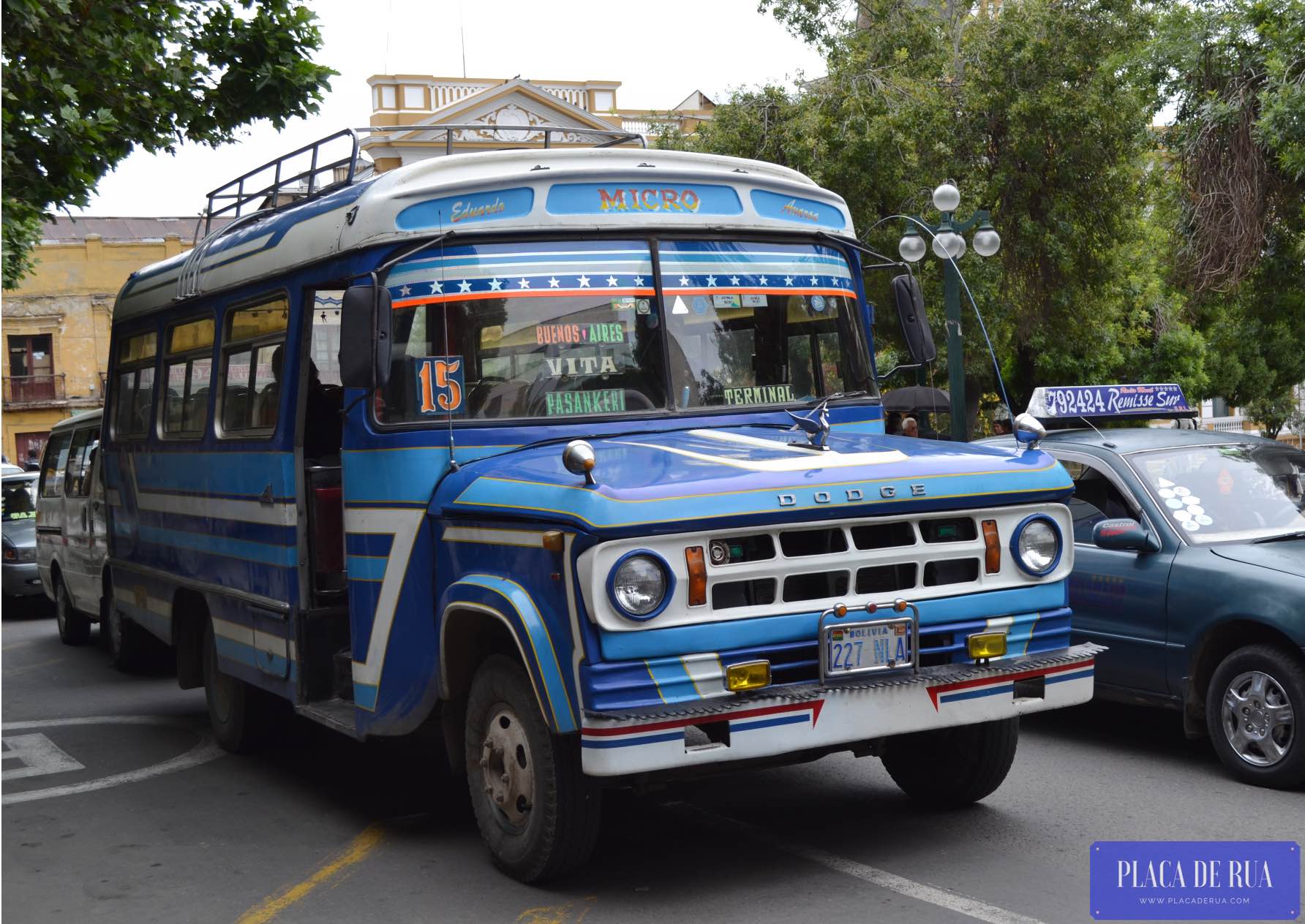 (Na Bolívia, a maioria dos ônibus coletivos são aqueles do tempo antigo, mas coloridos e dignos de fotos memoráveis. Quase todos são da marca Dodge, mas de vez em quando, surge um Nissan, um GMC ou até mesmo um Mercedes…)