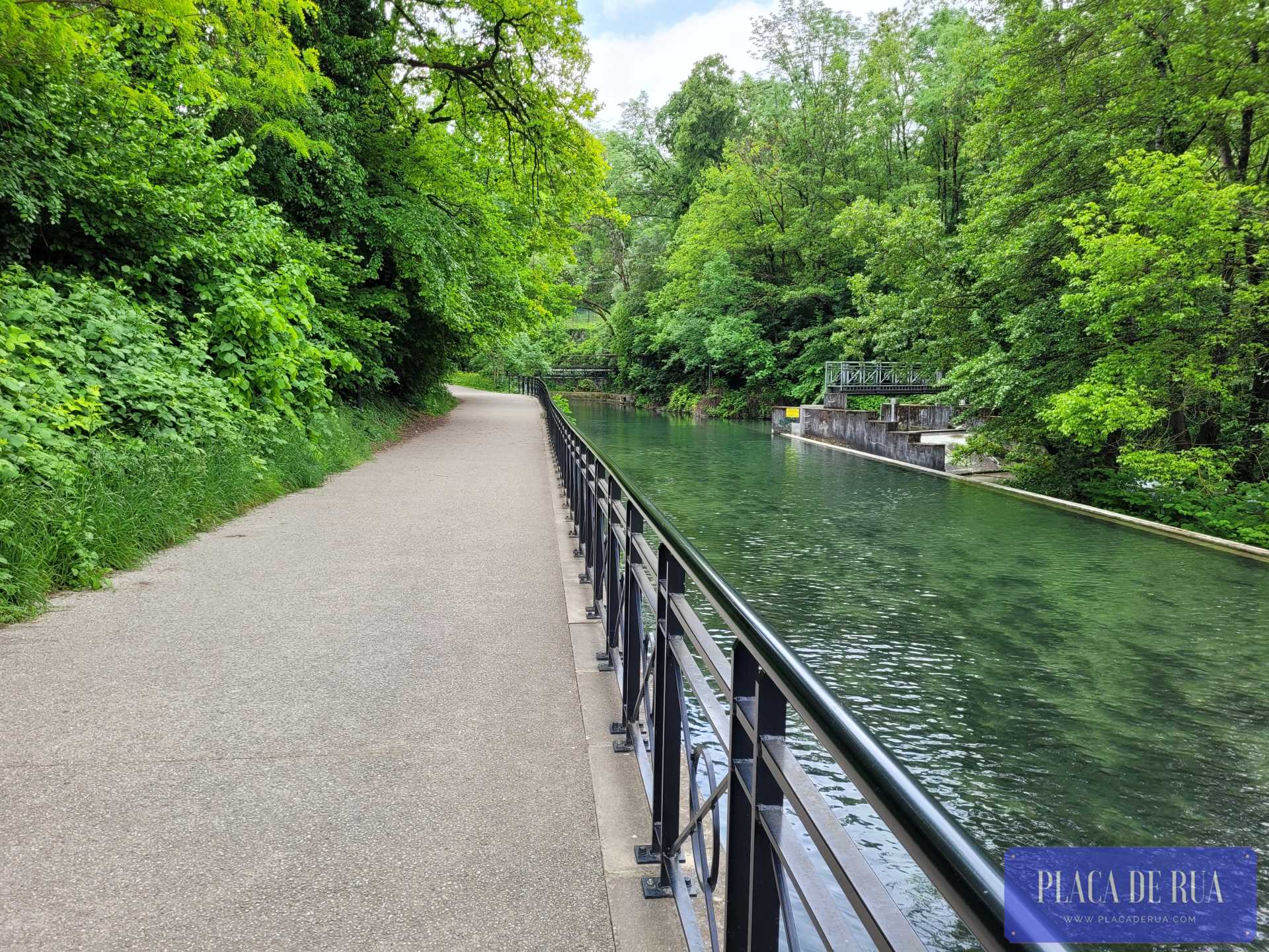 Só que aqui, a temperatura estava perfeita, a umidade ideal, o som suave do rio ao fundo, o canto dos pássaros daquele velho continente, a área sombreada em quase todo o percurso e as pontes e grades adornadas com lindas floreiras…